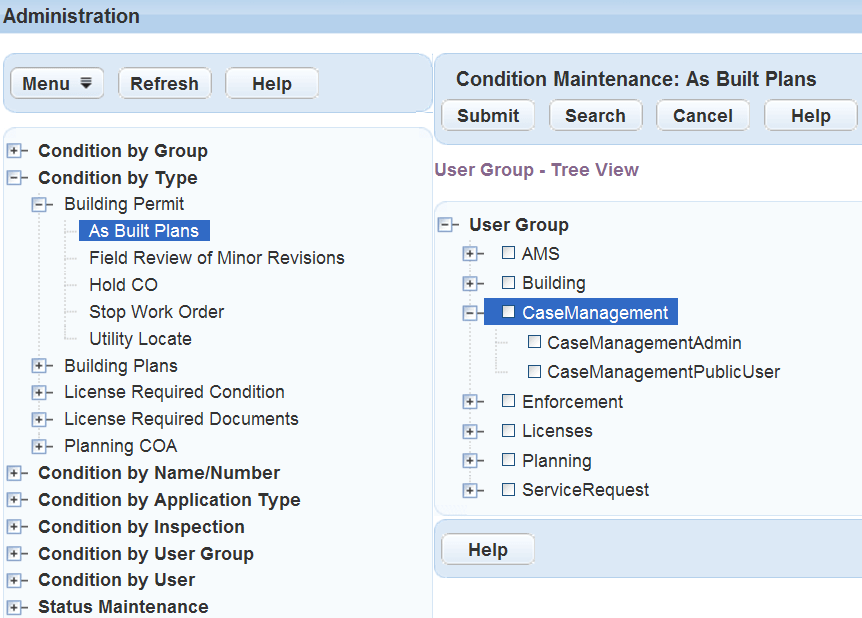 2. Use the main Administration navigation tree to locate the condition you need. You can locate a condition by Group, Condition Type, Name/Number, Application Type, Inspection, User Group, or User. If you cannot locate the condition name you want to apply, you can search for it. Refer to Assigning Conditions.